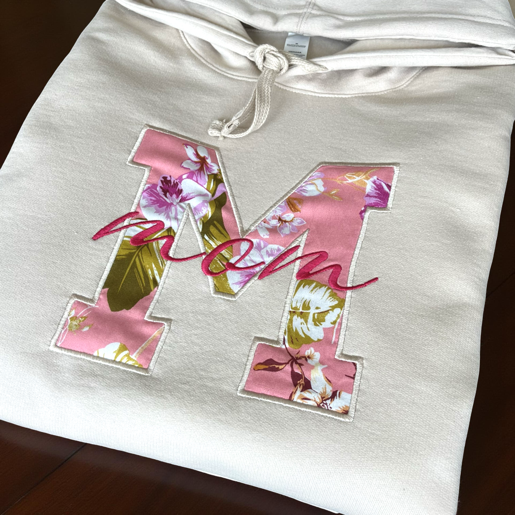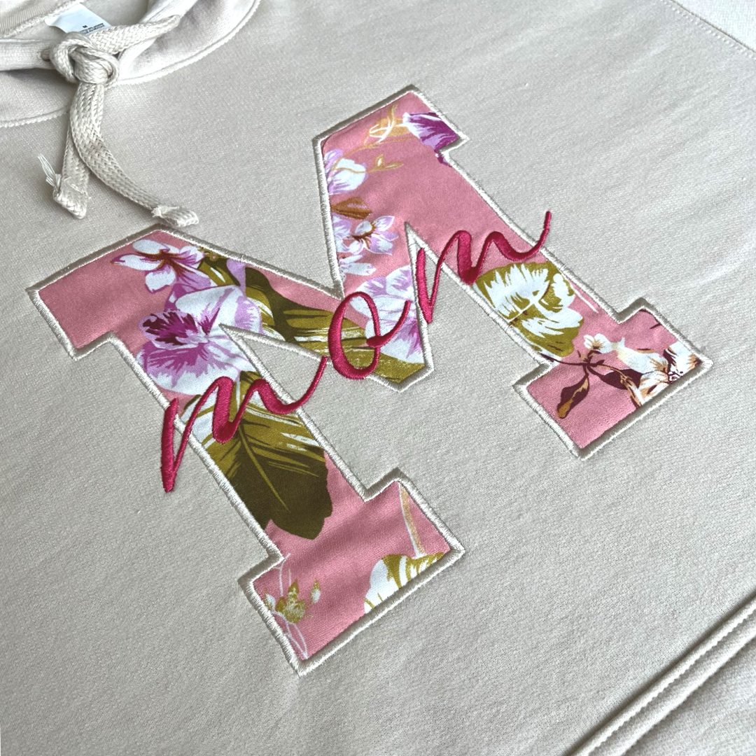 Hoodie color arena, con una “M” floral estampada en tonos rosa y la palabra "mom" bordada en fucsia.