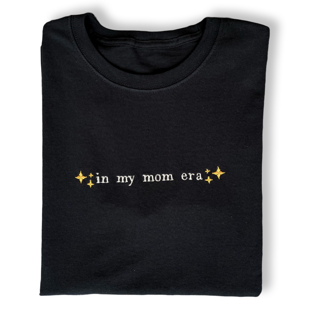 Brillando en mi etapa más poderosa: ser mamá. Playera 100% algodón color negro con bordado en color hueso y detalles de estrellas doradas. La frase "In my mom era" celebra una nueva etapa llena de amor, fuerza y un toque de sparkle ✨.